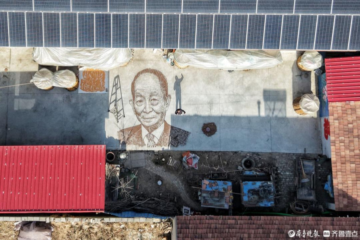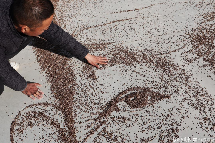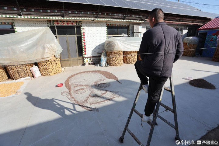 其实,从墙面到地面,从颜料到粮食,挑战是巨大的。地面上作画,定位、起型都难,无法像墙绘那样后退观全貌,他只能一次次爬上梯子俯瞰,再举着4米长的“自拍杆”俯拍并调整。最大的难点在于用麦子表现人物的立体与神韵。“一开始画出来像剪纸,没有明暗渐变。”他凭着多年绘画的积累,将素描中的黑白灰关系融入其中,通过麦粒疏密来营造明暗。人物的眼神是关键,眼角眼珠耳朵鼻子,甚至牙齿,每一个细节他都精益求精。为了更好地呈现效果,他甚至将院子里的地面重新改造。