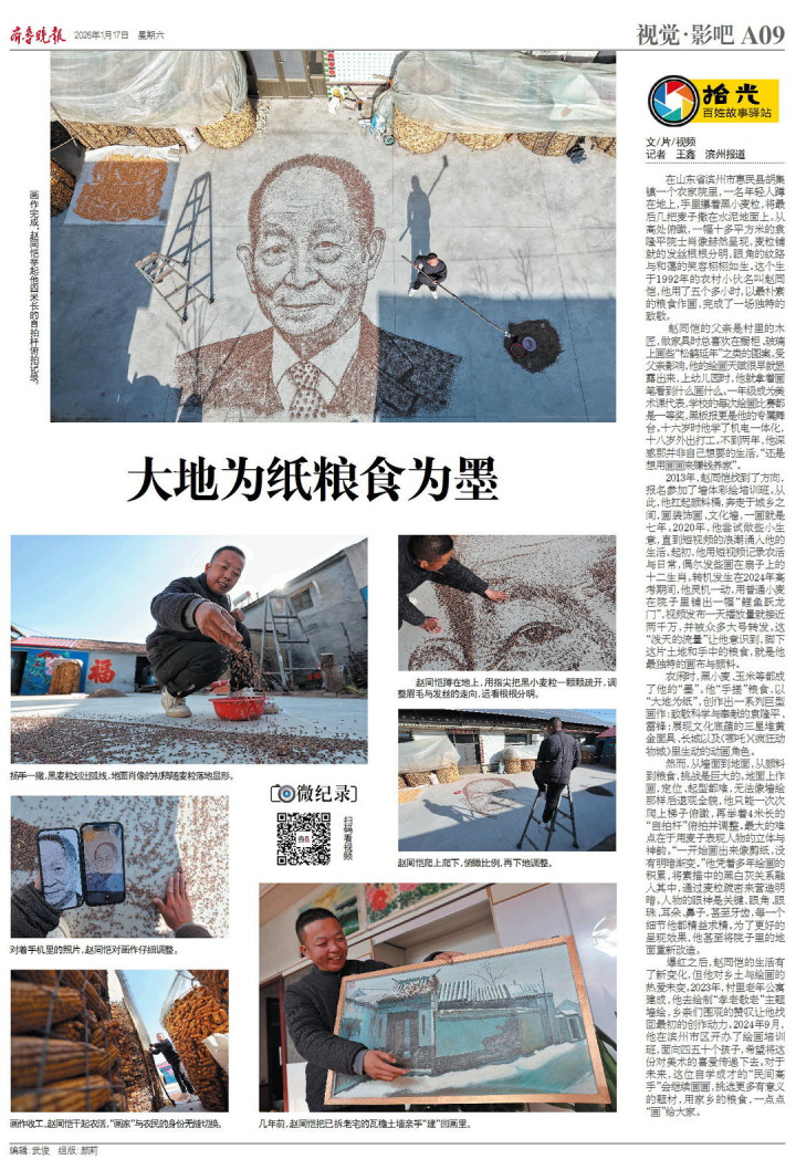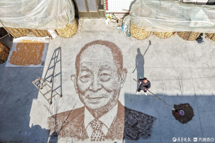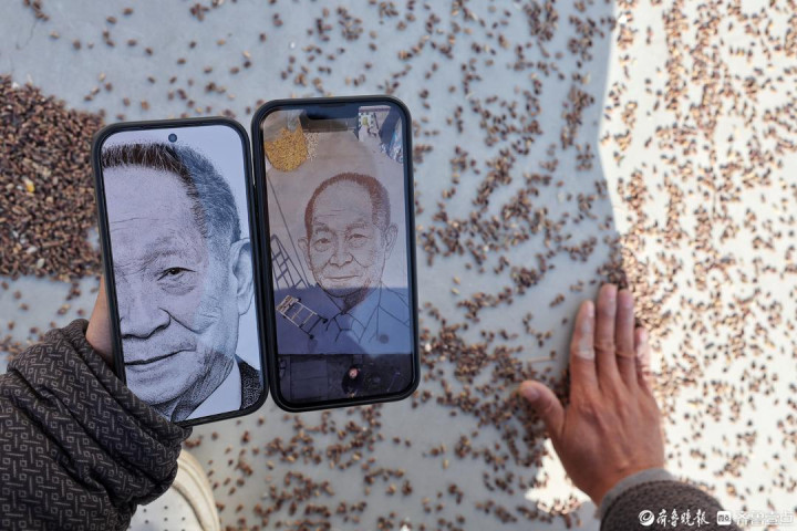 在山东省滨州市惠民县胡集镇一个农家院里,一名年轻人蹲在地上,手里攥着黑小麦粒,将最后几把麦子撒在水泥地面上。从高处俯瞰,一幅10多平方米的袁隆平院士肖像赫然呈现,麦粒铺就的发丝根根分明,眼角的纹路与和蔼的笑容栩栩如生。这个生于1992年的农村小伙名叫赵同恺,他用了五个多小时,以最朴素的粮食作画,完成了一场独特的致敬。